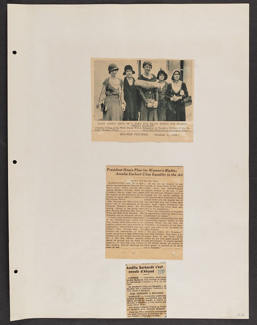 Two pages from Amelia Earhart’s scrapbooks containing a newsletter and newspaper clippings
