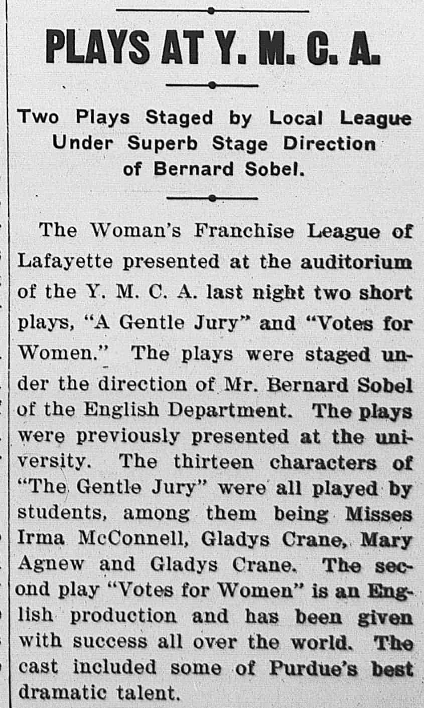 Articles from the Purdue Exponent about plays depicting suffragists and the movement as presented