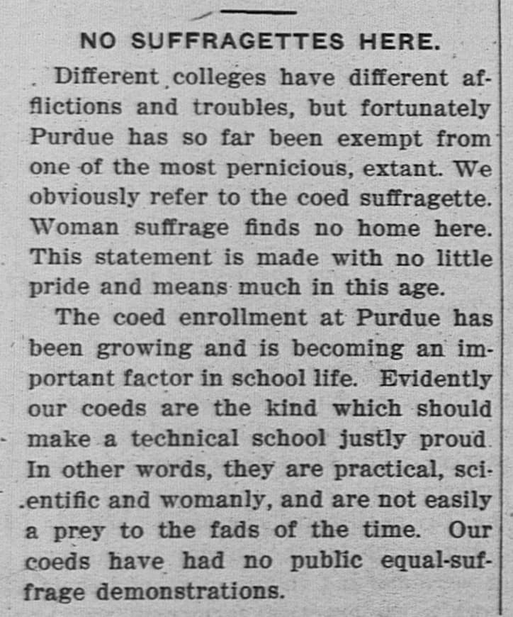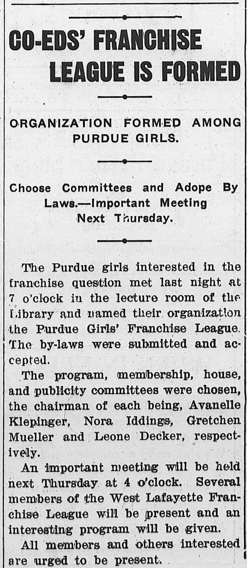 women students even formed a Purdue chapter of the Woman’s Franchise League on