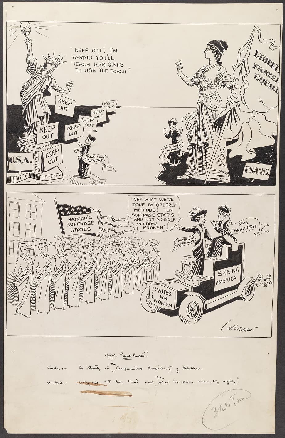 “The Gentle Jury” and “Votes for Women,” depicting suffragists and the
